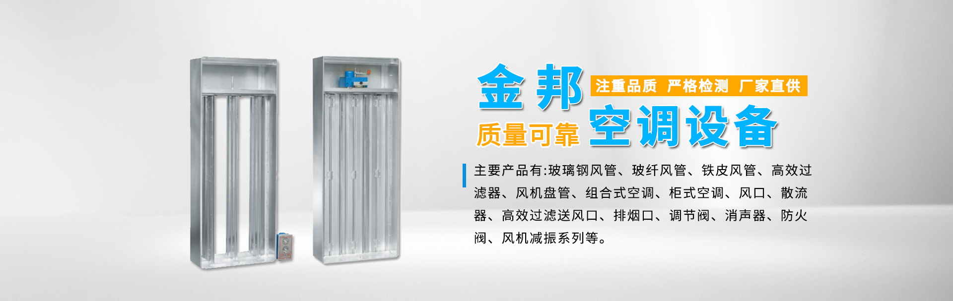 江蘇金邦空調(diào)設(shè)備制造有限公司專業(yè)生產(chǎn)玻璃鋼風(fēng)管、玻纖風(fēng)管、鐵皮風(fēng)管、高效過濾器、風(fēng)機盤管、組合式空調(diào)、柜式空調(diào)、風(fēng)口、散流器、高效過濾送風(fēng)口、排煙口、調(diào)節(jié)閥、消聲器、防火閥、風(fēng)機減振系列等產(chǎn)品